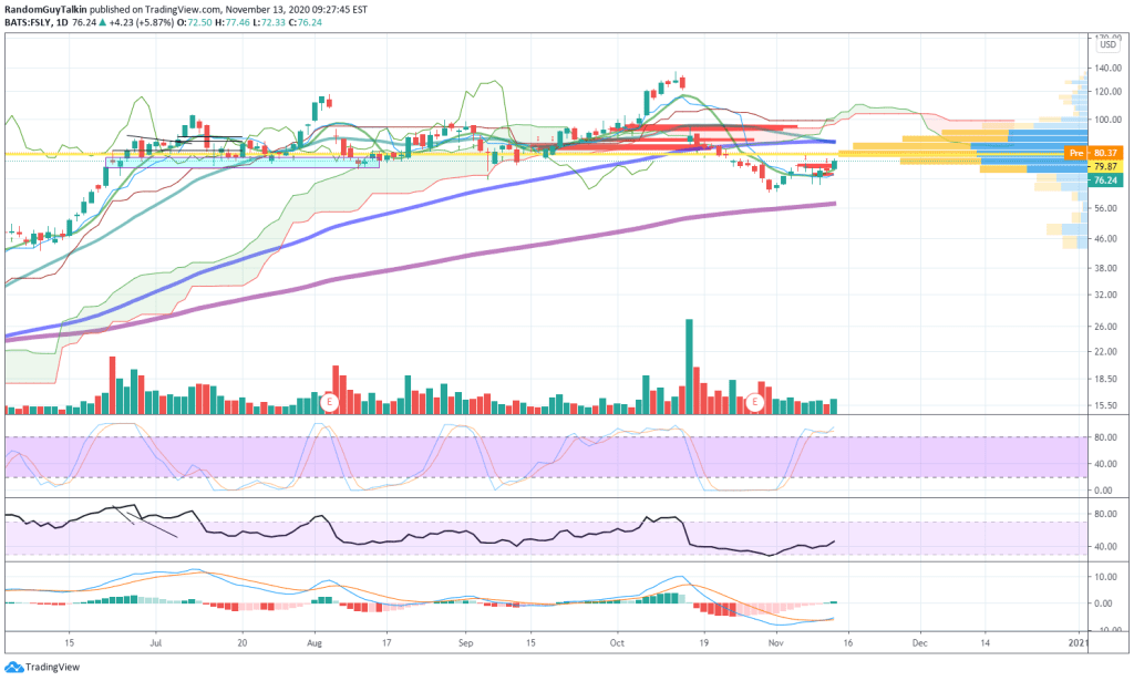 FSLY breaking past key resistance but stoch RSI is quite high, RSI is low and the MACD cross happened. IMO great to still long, holding where it has to and is ready to go. FSLY had good earnings relative to where the stock was, I believe it is to go to the 90$ zone.