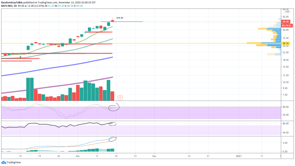 NIO putting in a sell signal with high volume hitting a wall and putting in a strong hammer. I see a world where you are out of buyers, and the earnings will be more of a sell than a buy after expectations are even more charged with LI and others reporting prior and smashing post earnings. I would not long this stock, on a 49.50 break and hold, you will see 45 soon after and lower is possible if it breaks 45.